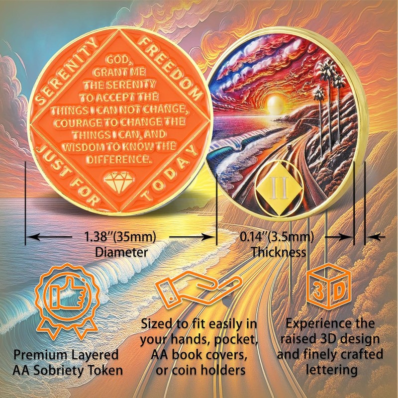 Leafence Sunset Beach Sobriety Coin Commemorative Coin Recovery Addiction NA AA Chips and Medallions with Inspirational Quote Narcotics Alcoholics Anonymous Gifts (Sunset Beach Road, 2 Years)