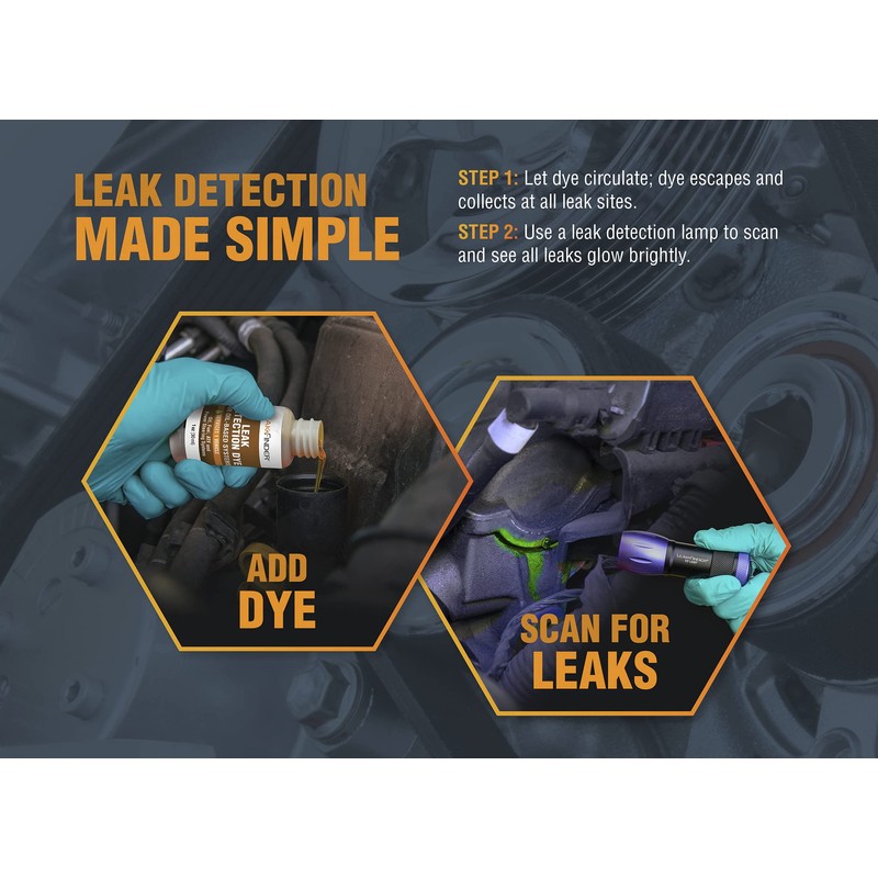- LEAK DETECTION MADE SIMPLE - Let the UV fluorescent dye circulate throughout the vehicle system. The dye escapes with the host fluid and collects at all leak sites. Use a LEAKFINDER leak detection lamp to scan and see all leaks glow brightly.