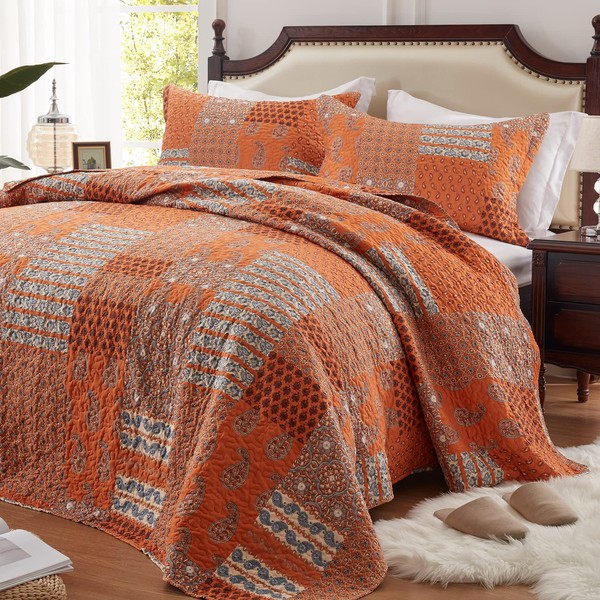 LEAONME 3 Pieces California King Size Quilt Set Burnt Orange Rust Oversized 120x120 Inch Bedspread Coverlet Lightweight Microfiber Paisley Bed Cover for All Seasons (1 Quilt, 2 Pillow Shams)