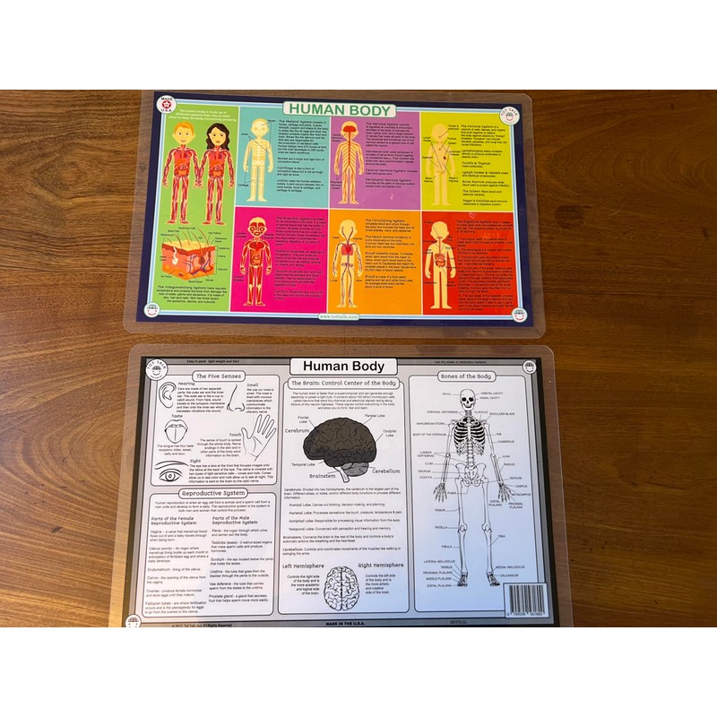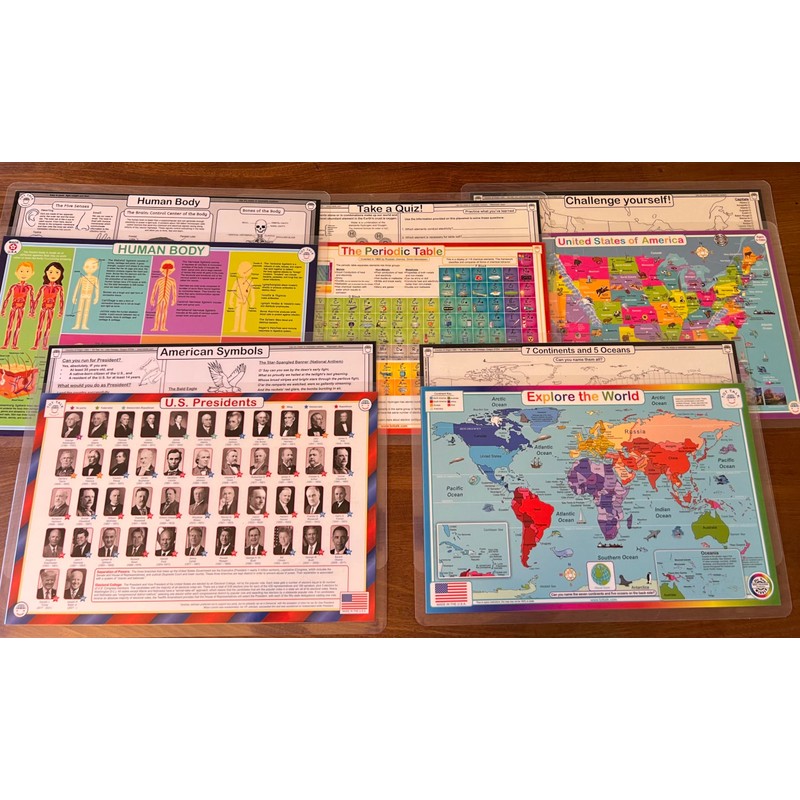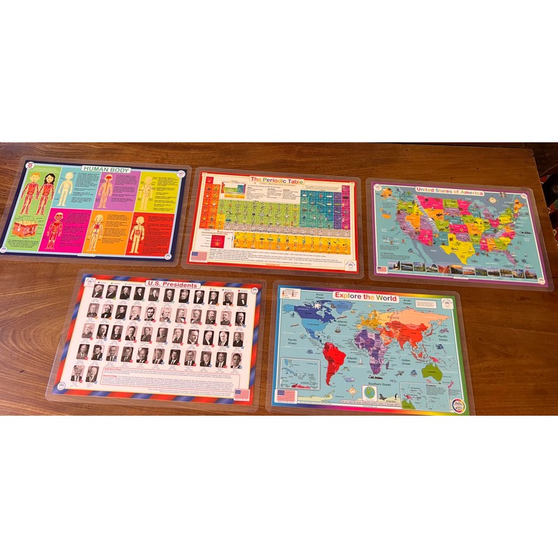 - Five Engaging Educational Topics - This colorful placemat set helps kids explore the human body, periodic table, U.S. geography, U.S. presidents, and the world map—making learning fun during mealtime or play.