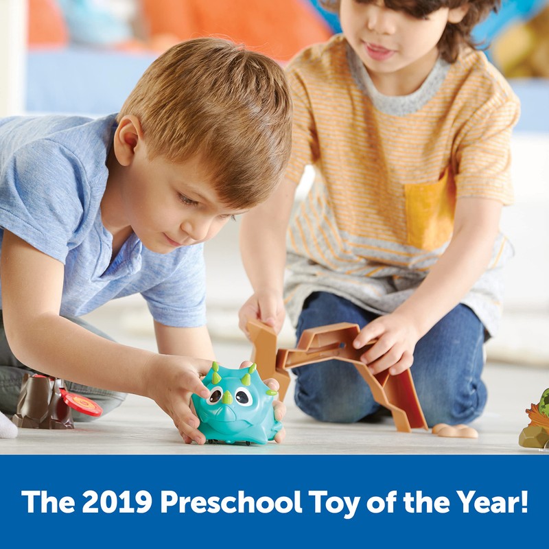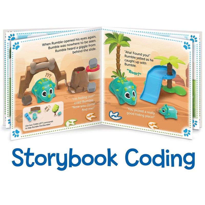 Meet the Coding critters: your first coding friends! These playful Dino pets bring early STEM concepts to preschool learning through 100% screen-free coding. Kids code along with their new pets’ storybook adventure, and help the clumsy rumble and bumbling bumble have a playtime they'll never forget! Each storybook coding challenge unfolds in the Coding critters' Fun pet playset - can you code rumble to play hide and seek, Chase down a boulder from his VOLCANO launcher, or knock over his break-apart cave? In addition to following along with the storybook's coding challenges, you can also use the pet playset to design your own code games and more! The Coding critters also double as cute interactive pets - Press rumble's nose to activate play mode, where you can feed, pet, and take care of your new Dino robot pal! You can even make her dance and sing a silly song!