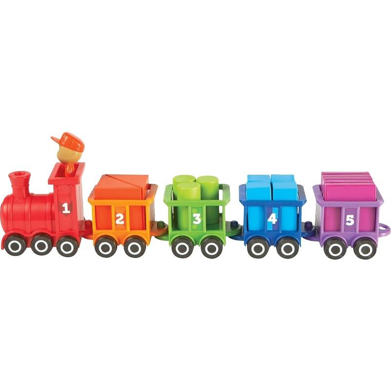 - BUILD: Five-caster train set builds color, shape, and number recognition with blocks that double as building toys
