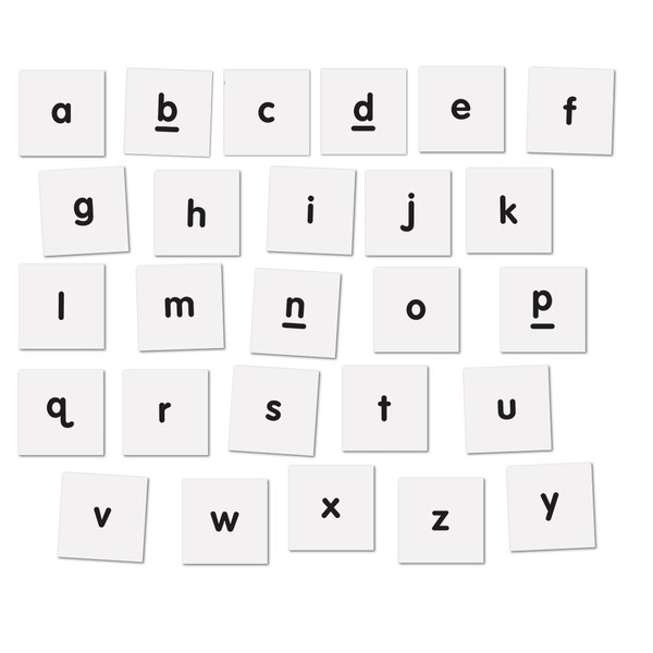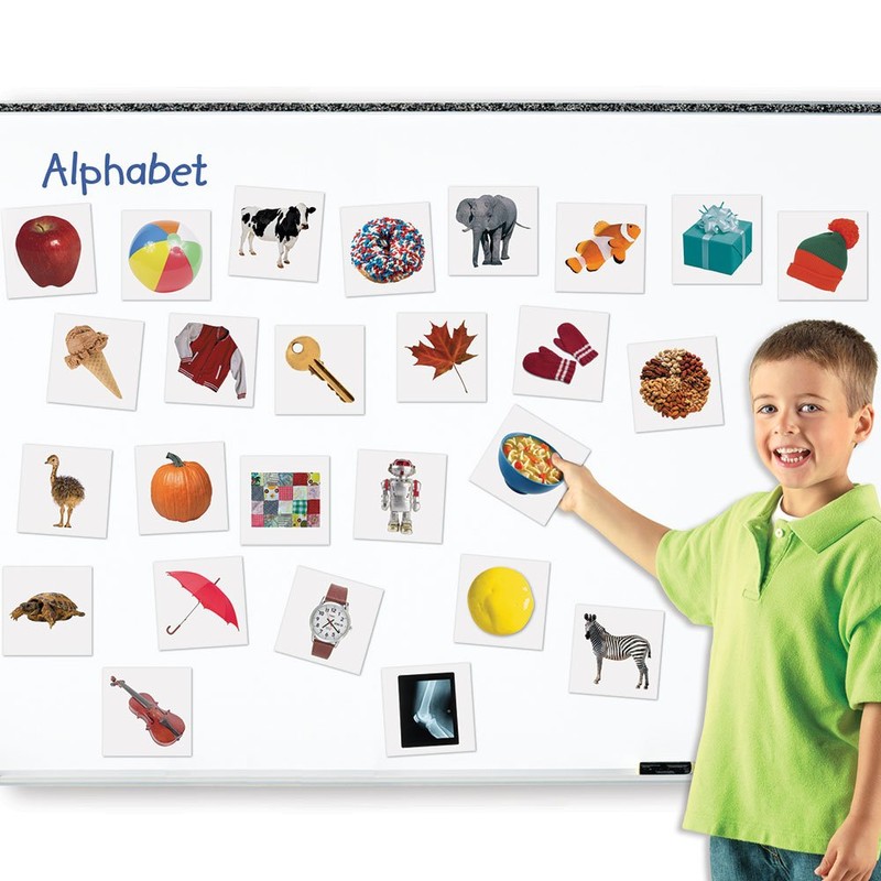 - Set of 26 double-sided magnets features photos of familiar object on one side and lowercase letters on the other