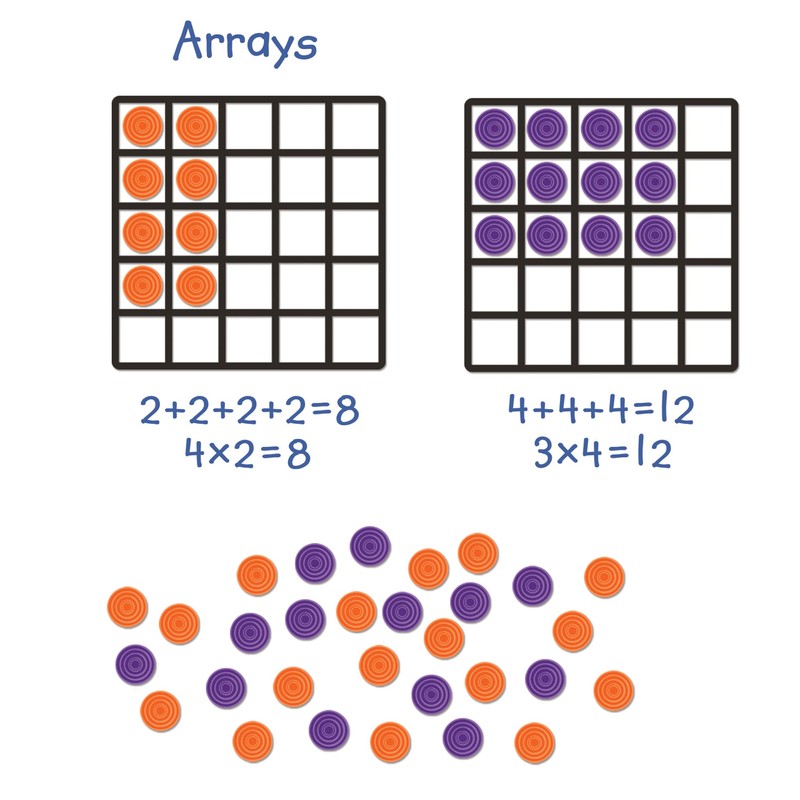 Teach multiplication right on the whiteboard with these jumbo math tools – big enough for the whole class to see. Great tool for teaching multiplication as repeated addition and division as repeated subtraction. Includes 2 magnetic 5 x 5 arrays, 50 discs, and activity guide. Arrays measure 9.75” x 9.75”.