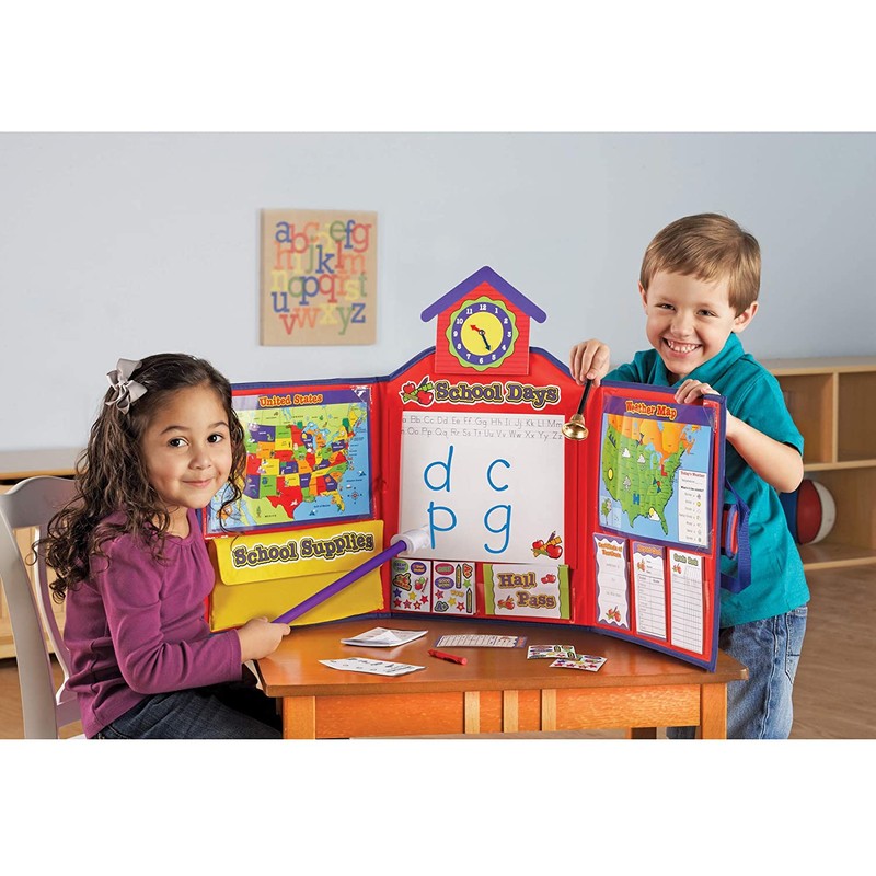 play teacher. This pop-up, tri-fold play set includes 149 supplies for