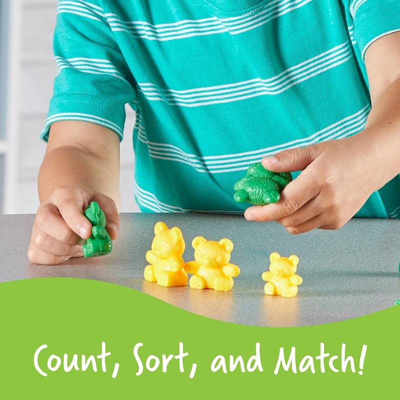 - 96-piece set includes 24 Papa, 24 Mama and 48 Baby Bear counters, storage container, and activity guide