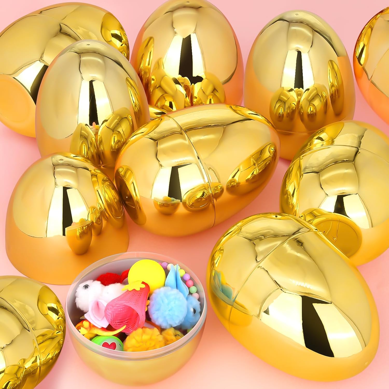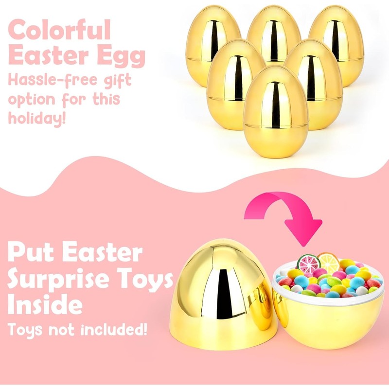 - [ Fillable Easter Eggs ] Make Easter memorable with our fillable jumbo golden eggs. Create a unique Easter egg hunt experience by hiding surprises or treats within these delightful eggs. Watch the excitement unfold as the little ones discover the treasures inside