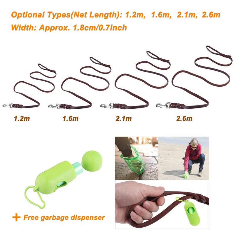 - Leather dog leash dimensions: the leather training lead has a length of: 1.2 / 1.6 / 2.1 / 2.6 metres. Four specifications; width: 1.8 cm, 360° roll connector, which makes walking the dog more comfortable and easier. Can hold all types of dogs from medium to large dogs such as Canaan, Retriever, Dogo, Shepherd, Bernese Mountain Dog, Great Dane, Rottweiler. Great leash for patrolling, running, walking, training equipment.