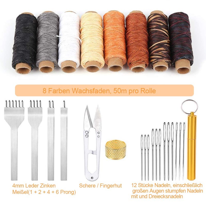 - Leather sewing tool - 8 colours leather wax thread with leather hole chisel, hand sewing needles, scissors, thimble and needle bottle.