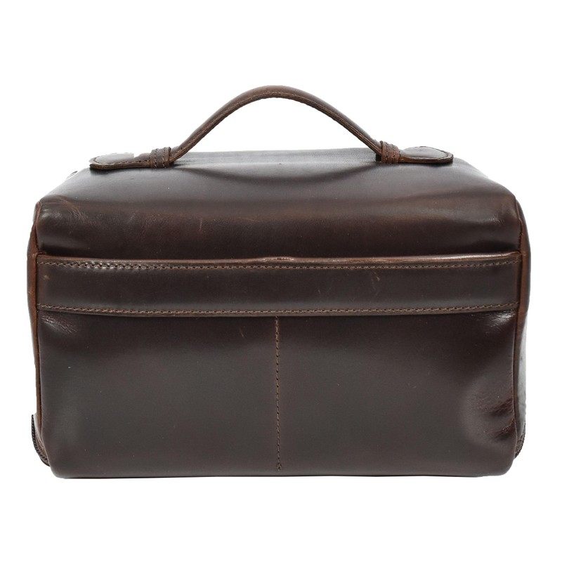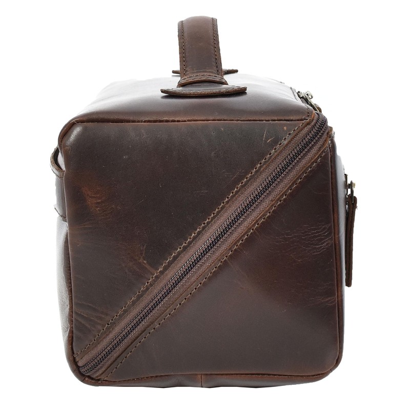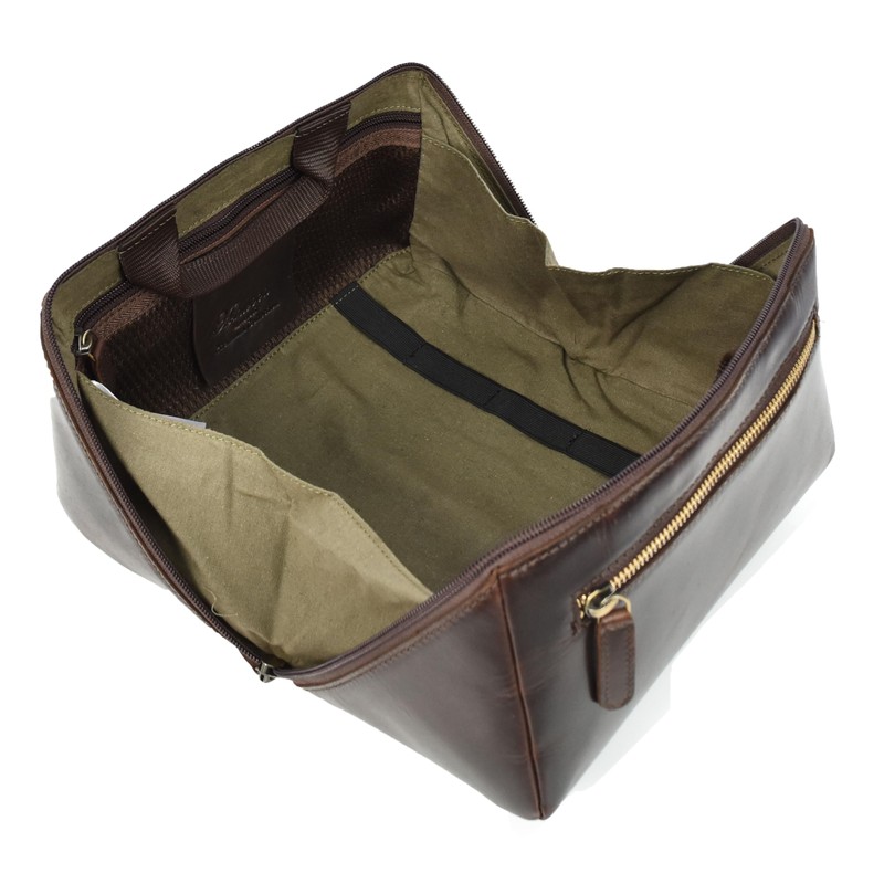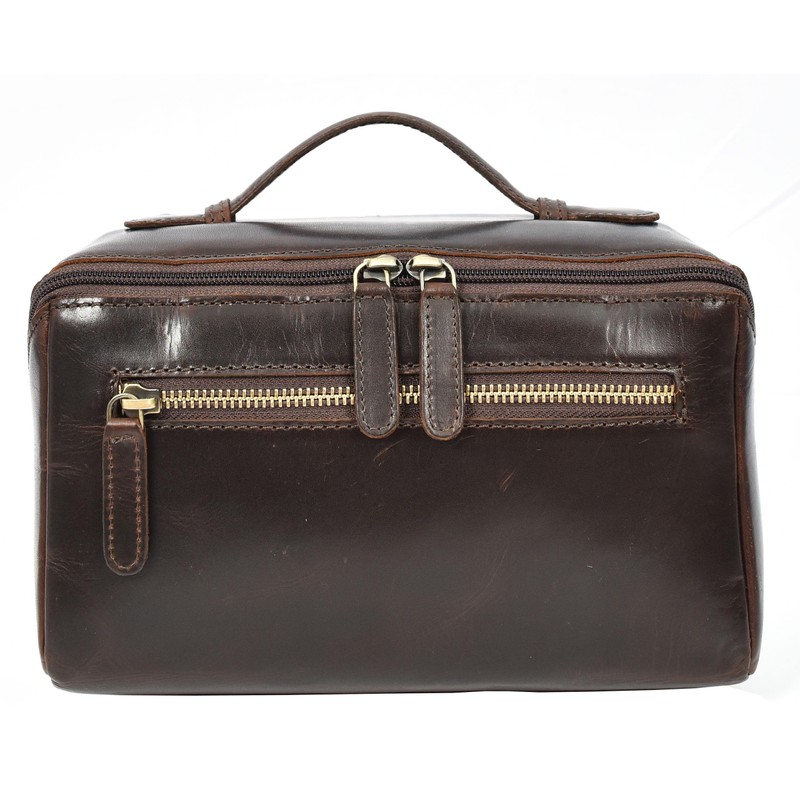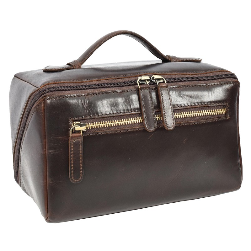 Leather Toiletry Bag Brown Travel Wash Bag, Men's Cosmetic and Shaving Kit Organiser with Multiple Zipped Compartments Unity