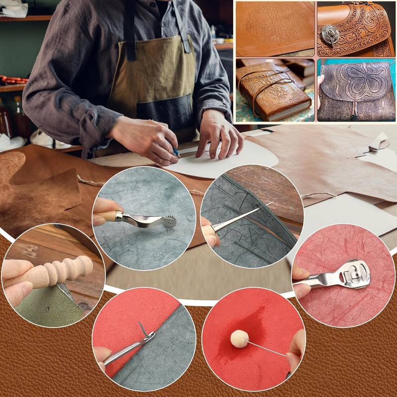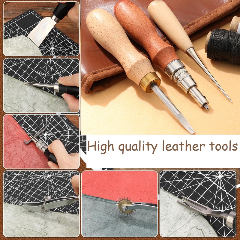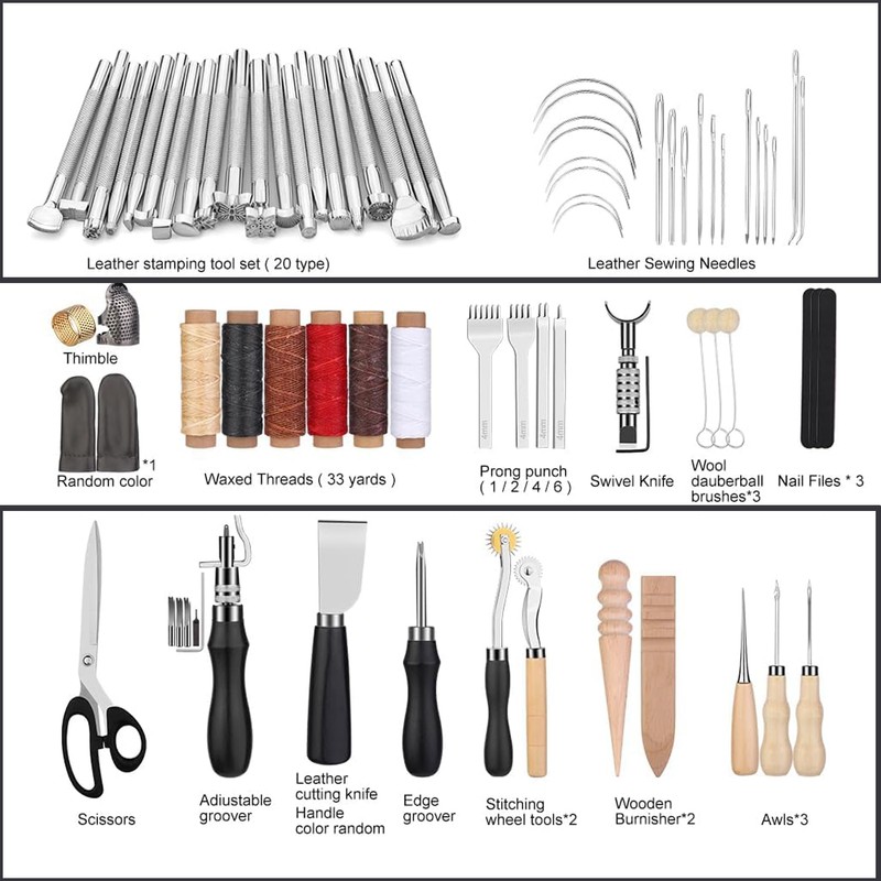 - Fully functional Leather Craft Kit: This set of tools can cut, sew, carve, press, sew, press, sand,This is a complete leather work kit that will help you complete the entire leather DIY. Including stamping tools, wax thread, sewing thread, punch, punch, leather cone, multi-function groove, replaceable blade and other accessories to meet your various DIY, and long enough to use.