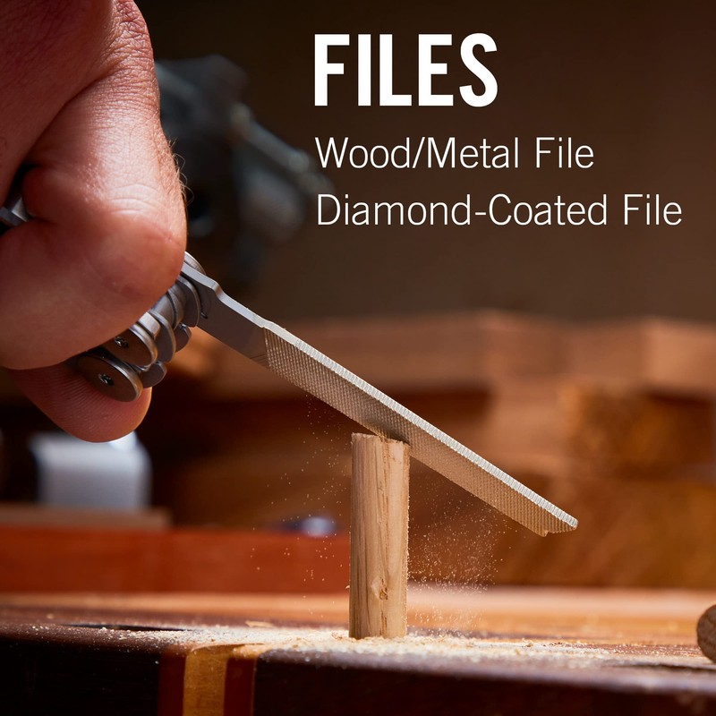 - Instant toolkit: Packs a quiver of 18 tools, including pliers, replaceable wire cutters, wire stripper, knives, saw, spring-action scissors, ruler, can & bottle openers, files and screwdrivers