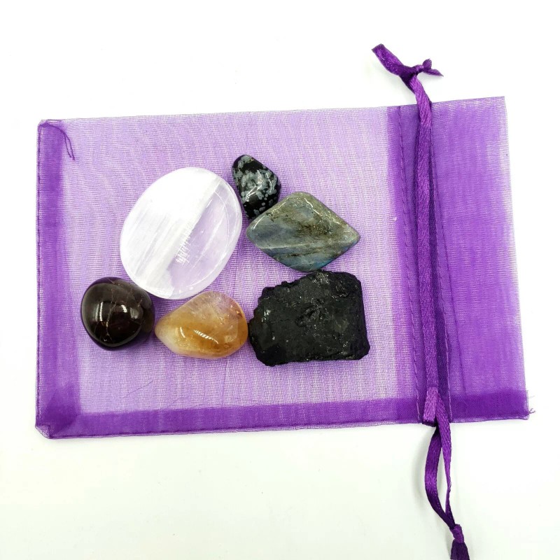 Stone set includes six tumbled crystal stones, one rough stone, a sheer garnet pouch, and an information card.