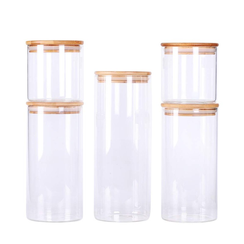 - [Convenient & Attractive ] 5 piece canister set in clear glass to find your kitchen goods quick and easy. The wooden lid and clear glass offer minimalist and modern design that blends in perfectly with your appliances and kitchen decor.