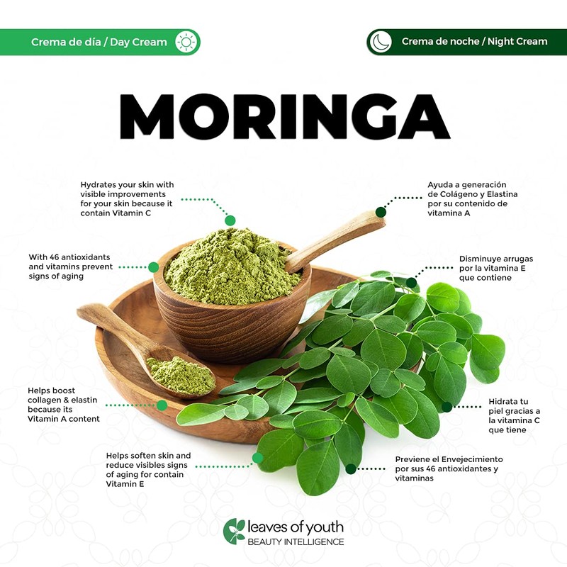 - La Moringa Nutre e Hidrata por su Alto Contenido de Vitaminas A, B, C y E, Regenera la Piel ya que Contiene 6 Aminoácidos que ayudan a la formación de Colágeno y Elastina, Contiene 46 Antioxidantes y 36 Antiinflamatorios