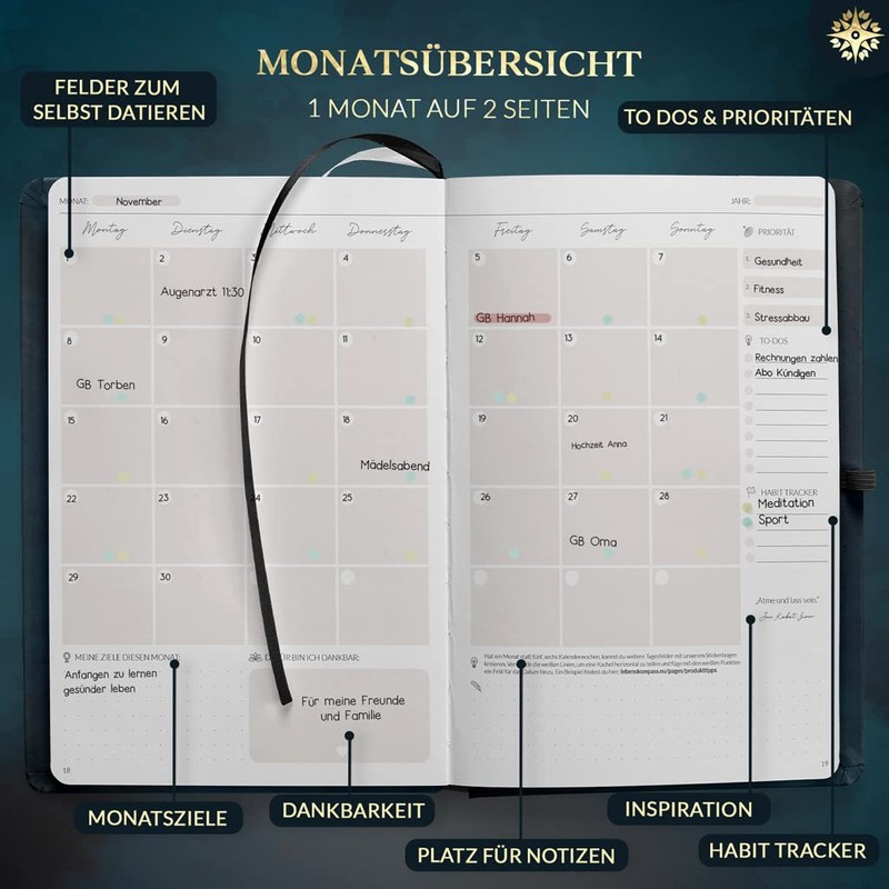 • Weekly and monthly planner: The undated Lebenskompass planner has a double page for weekly planning. In addition, you can create an overview plan for each month.