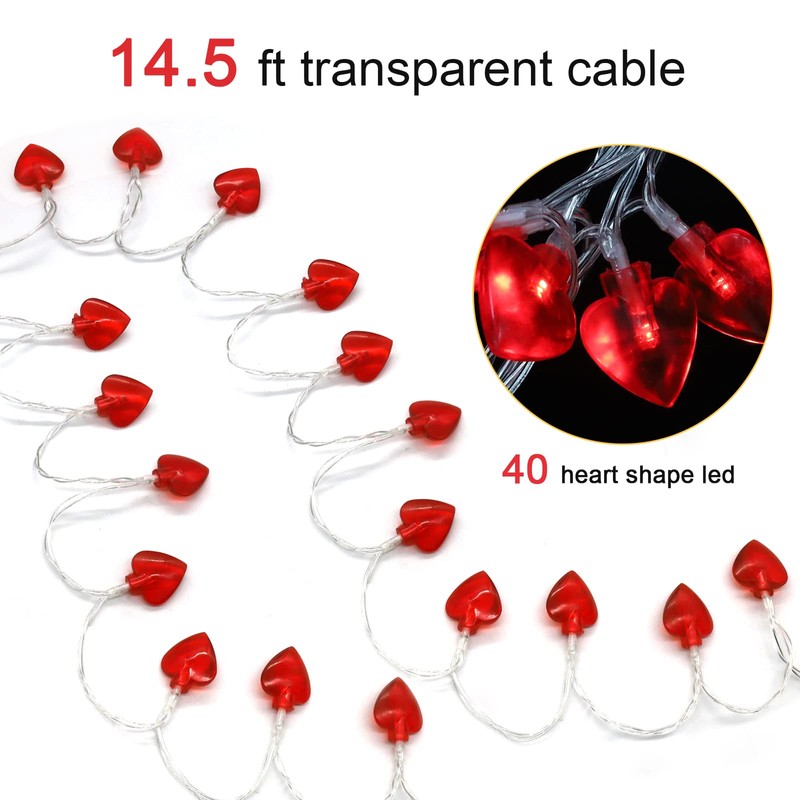 1. The Valentines day string lights are 14.5 feet long and with 40 mini red eart-shaped LEDs.