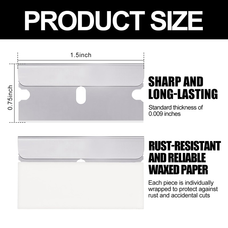- Convenient Size:The size of each single edge razor blade measures approximately 1.5 inches in length, 0.75 inches in width, and 0.009 inches in thickness, making them compatible with most standard scrapers and razor blade tools. This saves you time in choosing the right size for your projects