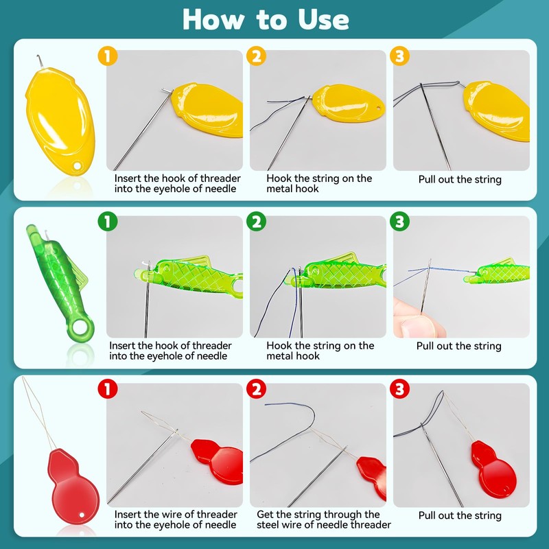 - 4 Types of Needle Threader Tools Multiple types of needle threading tools can meet your different usage needs in various scenarios and preferences, no matter for hand sewing or sewing machine. With simple threader for needles, you can achieve fast needle threading, flexible use and easy to pass through all kinds of needle eye holes without the help of others, greatly improved the efficiency of sewing work. Please see the pictures or product description for detailed usage method about embroidery needle threaders