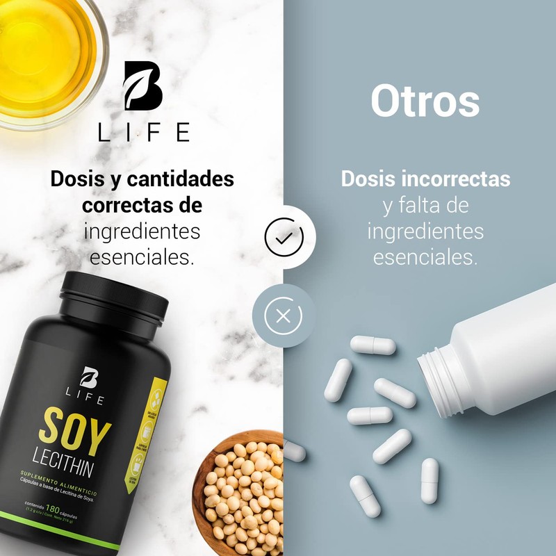 Lecitina de Soya de 180 Cápsulas blandas de 1200 mg. Ingredientes naturales. Soy Lecithin B Life.