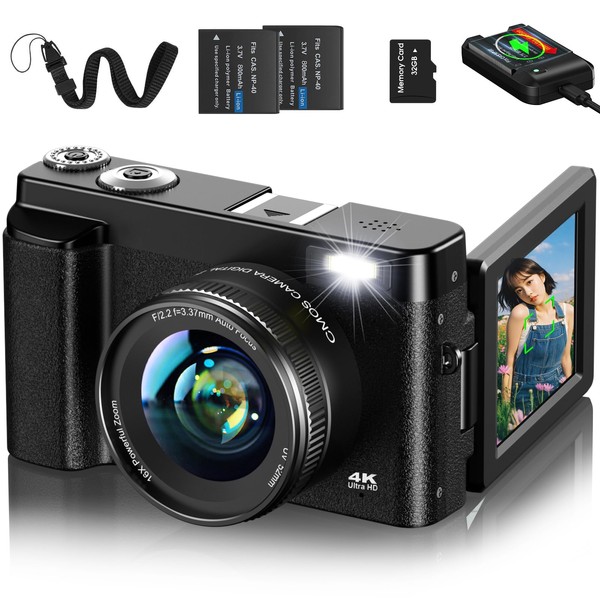- 2 Extra Batteries & 32GB Micro SD Card: This digital camera comes with 2 high-capacity batteries. You don't have to worry about the remaining battery power while on the go, and you can shoot for a long time. Comes with a battery charger for convenient use. Various charging methods can be used for outdoor charging. Perfect for long shots of athletic events, recitals, seminars and concerts when shooting distant subjects. In addition, this product also comes with a 32 GB MicroSD card, so it can be used immediately upon arrival. Please note that this product supports up to 128GB Micro SD card. Professional camera case and hand strap are included, perfect for outdoor photography