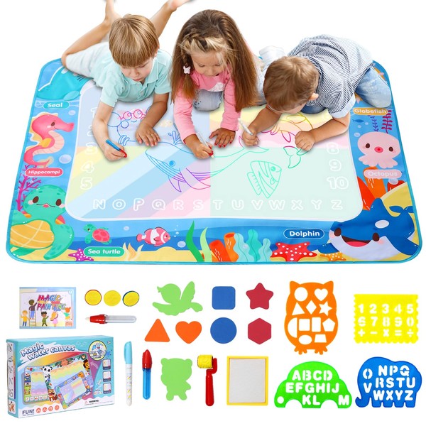 LEcylankEr Water Doodle Mat 120 x 90 cm, Large Aqua Doodle Water Painting Mat XXL, Magic Doodle Painting Mat with Water Pen for 2-7 Years Old Boys Girls Children Baby Toddler (Ocean)