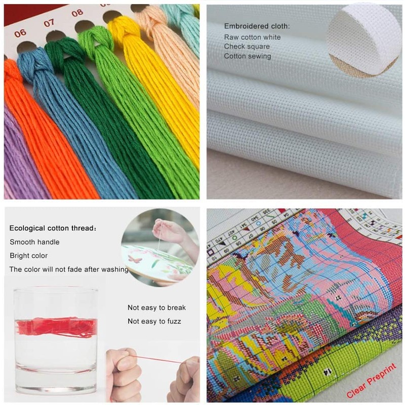 - 【Package & Size】 Fabric Size: 15.8x20.9 inches or 40x53cm; Packaging includes: Pre-sorted thread cardboard, 11CT Pre-printed cotton fabric, High-Definition pattern, pre-sorted embroidery thread, 2×needles, 1× English Instruction.