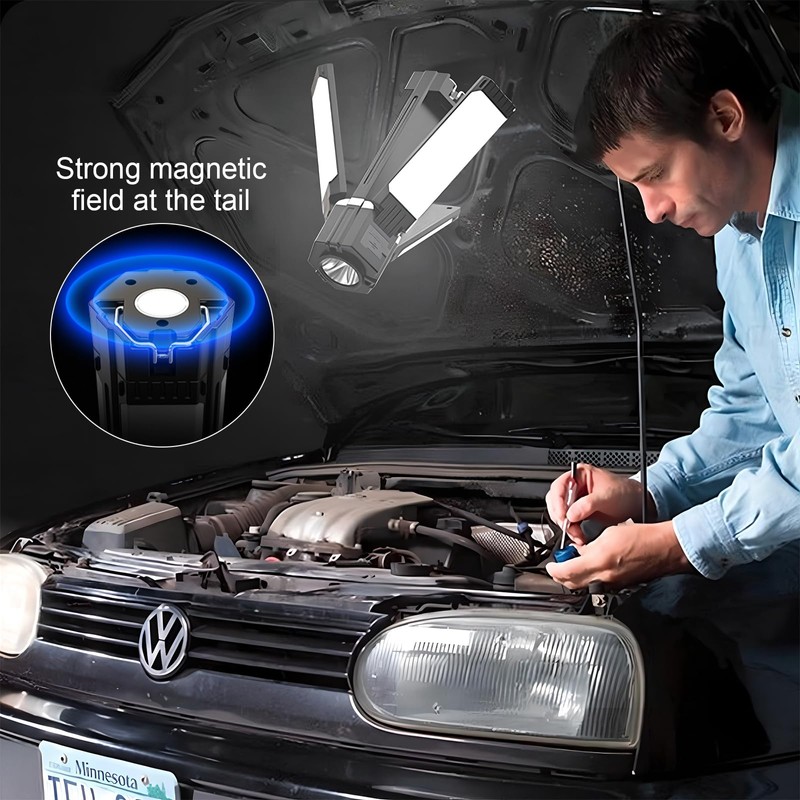 - 【Magnetfuß und Aufhängehaken】 Die Arbeitsleuchte verfügt über einen starken Magnetfuß und einen praktischen Aufhängehaken, sodass Sie sie problemlos an Metalloberflächen befestigen oder überall aufhängen können. Sie kann als Zeltleuchte aufgehängt werden und hält selbst bei Hurrikanen oder starken Erschütterungen stand. Der abnehmbare Leuchtenkörper kann auch freistehend auf einem Tisch aufgestellt werden.
