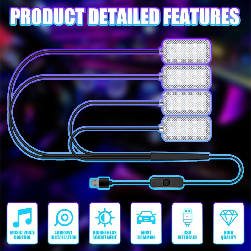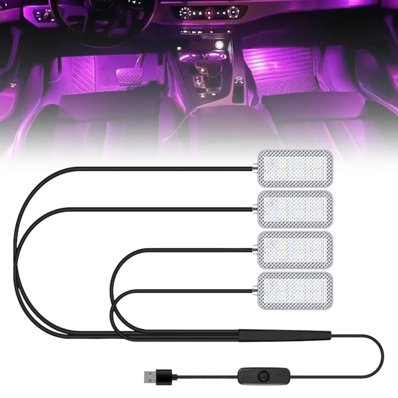 - 4-in-1 LED interior lighting: this USB ambient light for a trailer has four LEDs. The front cable is 113 cm long, the rear 160 cm. Each light is 4.2 x 2 cm. You can install the lights in the driver's main footrest, passenger footrest, left rear footrest or right rear footrest.