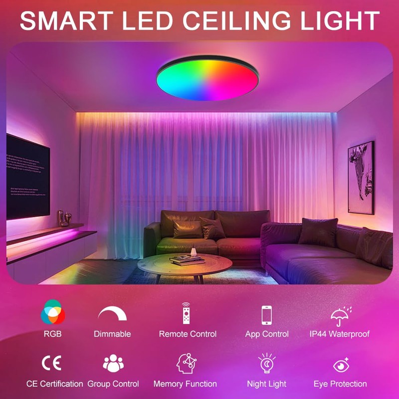 - RGB Color Changing: 16 million RGB colors are available to meet the needs of different situations. Dimmable Brightness The brightness can be adjusted from 10% to 100% and color temperatures from 3000K to 6000K. The intelligent LED ceiling light has light modes (reading, work, night, leisure, etc.) and can also change the colour according to the rhythm of the music to give you more atmosphere.