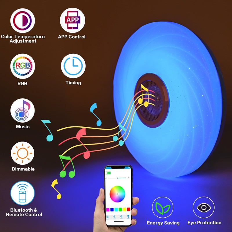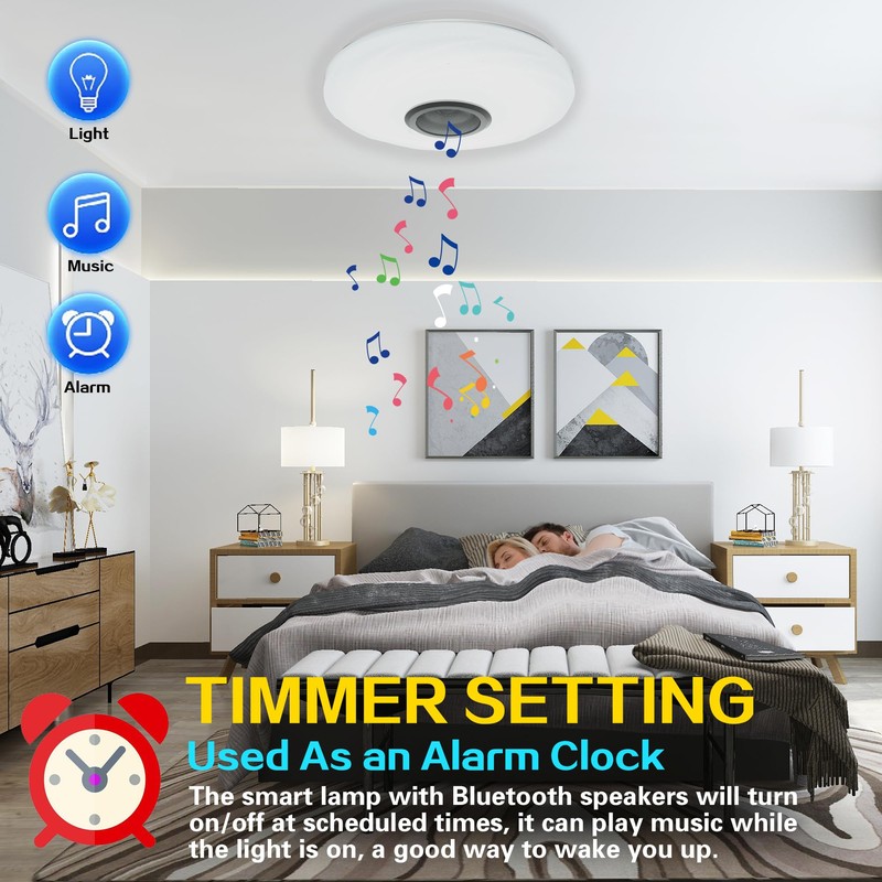 - Bluetooth speaker, timer function: This music ceiling light has a built-in Bluetooth speaker, you can connect your smartphone via Bluetooth to play music. You can also freely set the time when the light or music should automatically turn on and off. The music playback when the light is on can be used as an alarm clock, a good way to wake you up in the morning.