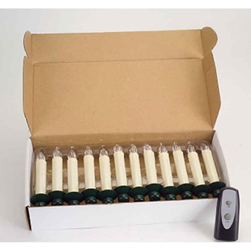 These beautiful clip on faux drip wax LED safe flame less candles will add a vintage and classical look to your Christmas and holiday decorations. They are perfect for your tree or garland displays. The green clip blends well into your holiday greenery. They are perfect for use in trees, wreaths, displays, garlands and more. A simple remote turns the candles on or off. Each candle uses 1 AA size battery and the remote uses 2 AAA batteries.
