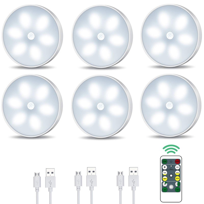 LED Closet Lights Motion Sensor Puck Light, USB Rechargeable Battery Powered Puck Lights with Remote Control, Dimmable Under Cabinet Counter Lighting Magnet Stick-on for Bedroom Kitchen (6 Pack)