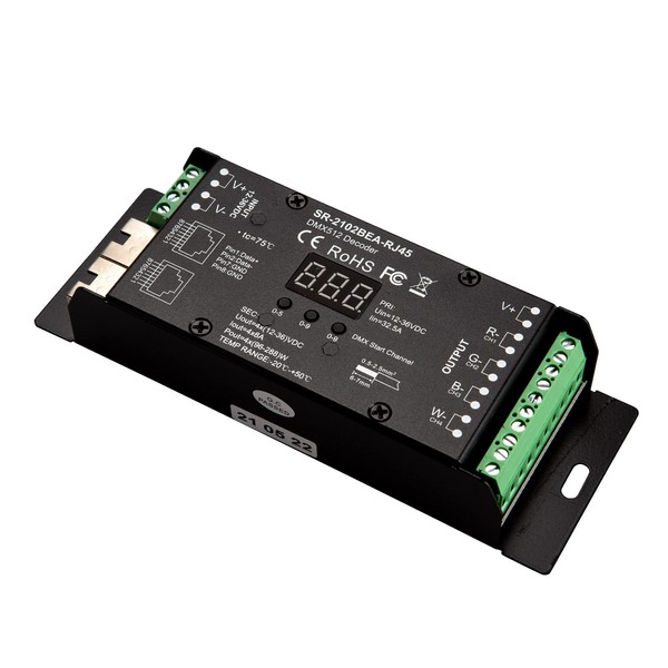 SR-2102EAS-RJ45 is a 4-channel constant voltage DMX and RDM controller that supports true 16-bit PWM resolution. The DMX controller has master and slave mode that are easy to switch. It offers full support for the latest DMX512, DMX512(1990), DMX512-A and RDM V1.0 (E1.20 - 2006 ESTA Standard) protocols. The DMX decoder is available with 4 channels, 8A per channel constant voltage output and in 12VDC, 24VDC and 36VDC. The DMX controller is equipped with simple wiring connections that do not require screws.