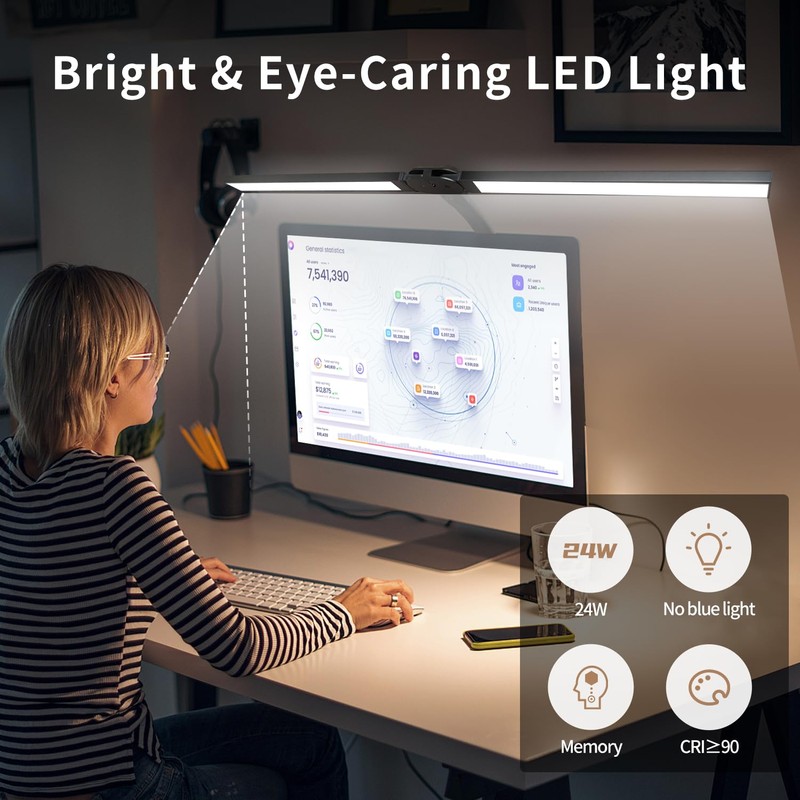 - 【Super Wide & Ultra Bright】 This 24W LED desk lamp has a double head design that allows you to adjust the angle of the light bar. The light can extend to 72 inches and fully illuminates the table. Suitable for multi-monitor workstation, home office, large desk, study, architect, computer, drawing, sewing, crafts, painting, reading, gaming, piano. Height up to 32.7 inches. The best LED desk lamp for working from home.