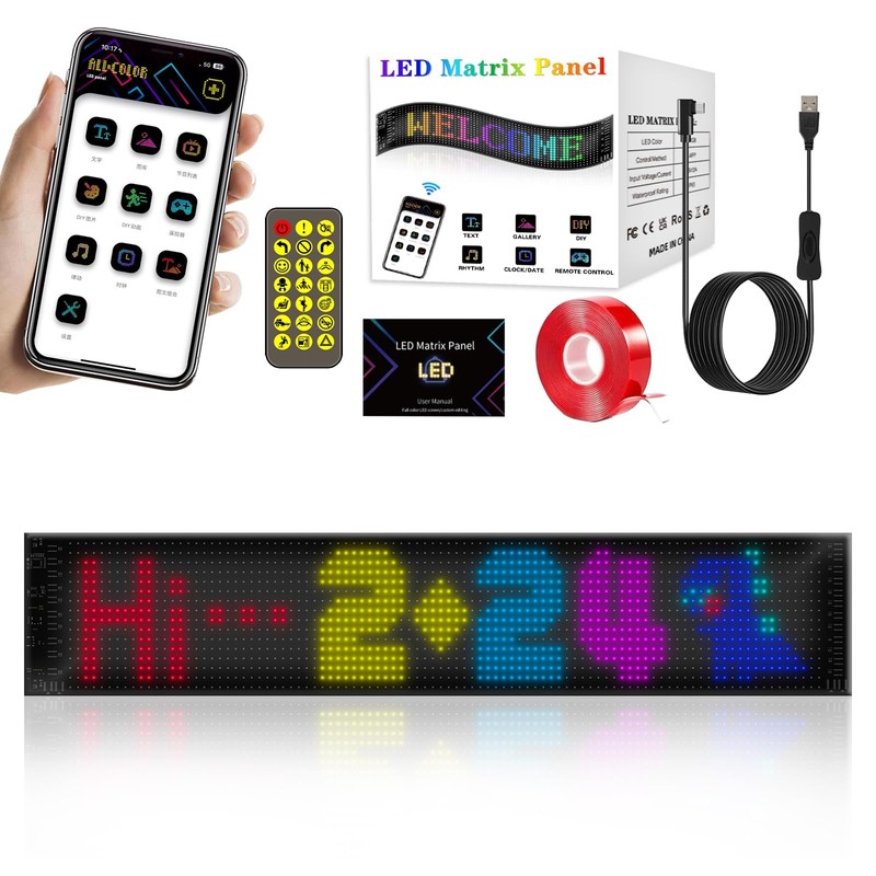 The LED sign includes a sticky tape for easy installation. To set it up, connect the sign to a USB power source and download the corresponding app on your phone to control the display