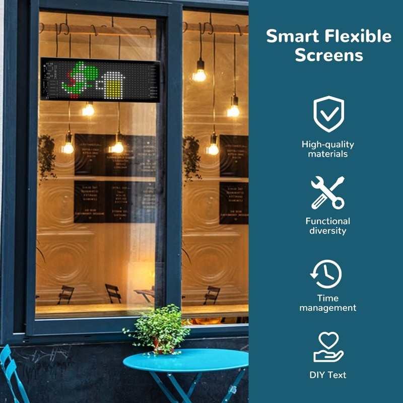 - 【Programmable Flexible LED Display】The Programmable Flexible LED Display (App + Remote) is very thin and light with a thickness of about 2 mm. The window colour flexible screen with eye protection can be bent, folded and shaped to fit different surfaces