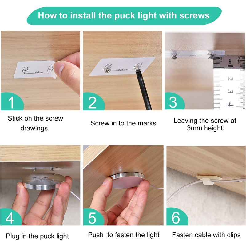 **As the ideal replacement of traditional halogen under cabinet lights, LED under cabinet lighting kit can be applied to various applications such as, kitchen, above/inside cabinets,under counters,worktop,showcase,floating shelf,accent display etc.** **FEATURES :** **ALL KITS INCLUDED:** This LED under cabinet lighting kit provides all necessary accessories: adapter, puck lights,remote, controller, splitter, extension cables, adhesive tapes, screws.what you need is just stick on the cabinet lights, plug in the adapter **LOW PROFILE CABINET LED LIGHTS:** The round under cabinet puck light is only 0.3” thickness, almost invisible under the cabinets or counters. **PREMIUM QUALITY:** The body for the LED under cabinet light kit is made of aluminum,ensures good cooling solution, extending the lifespan of these cabinet kitchen lights. **STRONG ADHESIVE TAPE:** moisture proof, not easily fell off.permanate useage. **ENERGY SAVING:** each under cabinet light has 2 watts (equals to a 25W fluorescent lamp), provides you with sufficient brightness and saves over 90% electric bill. **SAFE:** Power adapter is UL Listed and 12V low voltage,so the LED closet lights are touchable while working, safe for children no any risk of electric shock. **DIY CABINET LIGHT KITS:** You could wired the cabinet lights upto 10 units as your need, all cabinet LED lights linked in series, others still work even if any one defective. **EXTENSION CORD:** with 4 Pack 5ft extension white cord, not need to worry about the distance when you DIY the cabinet light kits. **Spec.:** Color: 6000K Daywhite Power:2W X 10 PCS Size: 2.3X0.3inch Power adapter: 12V 2A **Package: ** LED Puck light: X10 Extension cable: X4 Splitter: X1 Adhesive tape: X15 Cable clips:X25 Screw:X20 Remote:X1 Controller:X1 Adapter: X1 **WARRANTY ** 24 month warranty, for any defective parts.