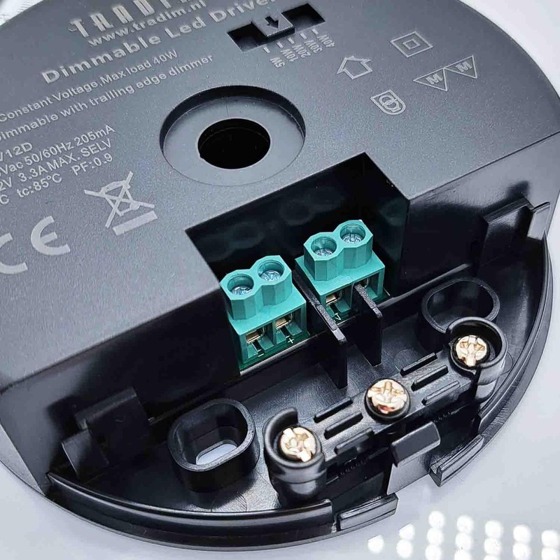 • High-quality LED driver for 12 V LED bulbs: circular transformer with variable power setting from 5 to 40 watts – for efficient and safe operation of dimmable 12 V DC LEDs in residential and commercial lighting. Box contents: 1 Tradim circular transformer - LED driver 12V DC