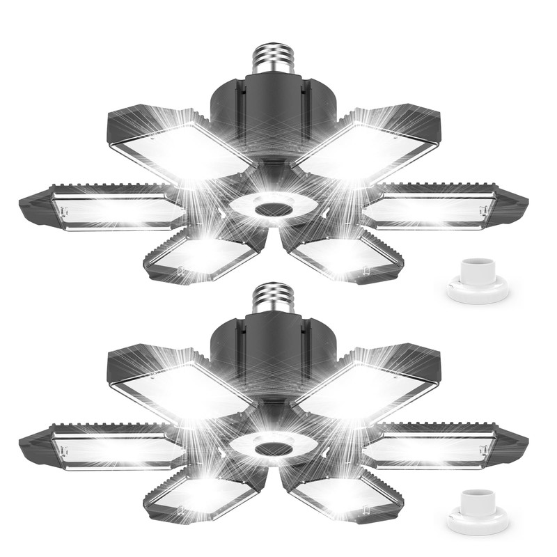 Led Garage Lights 2 Pack 200W Super Bright Ceiling Led Shop Lights, E26/E27 Base, 6500K, 22000LM Deformable Light Ideal for Basement, Attic and Workshop
