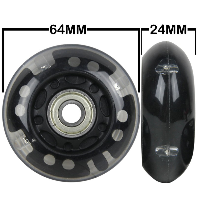 - Includes a pair of 2 64mm Wheels with Fast Abec 9 Bearings. These L.E.D Light up wheels are super easy to install and will fit on most inline skates, casterboards, ripsticks, and even luggage (make sure to check specs first, these are 64mm in diameter with a standard size 24mm width)