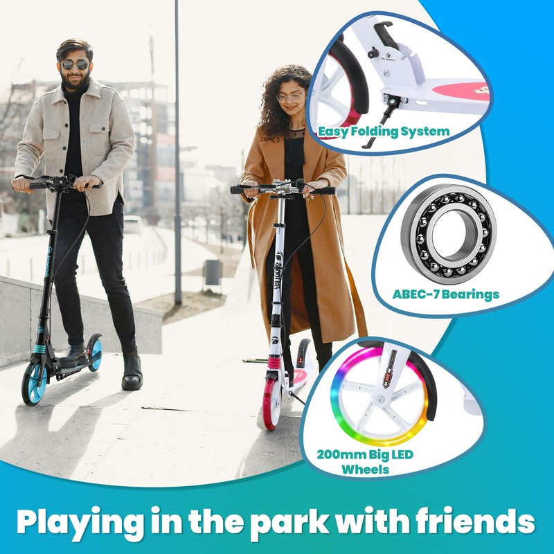 LED Light Up Large Wheels Scooter for 6 Years Old and Above Teens and Adults with Handbrake,with Carry Strap and Bell, Easy Fold, Height Adjustable (White)