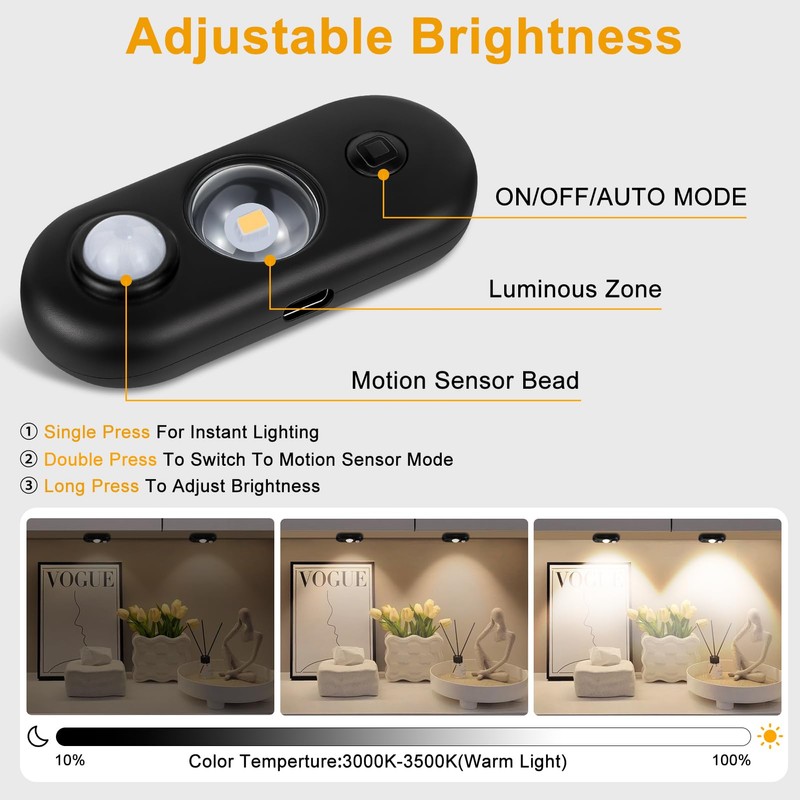 - 【Dimmable LED Puck light】: Long press the button, you can adjust the brightness of the LED motion sensor puck lights until you get the exact brightness. When it is in different tasks, just adjustable light source