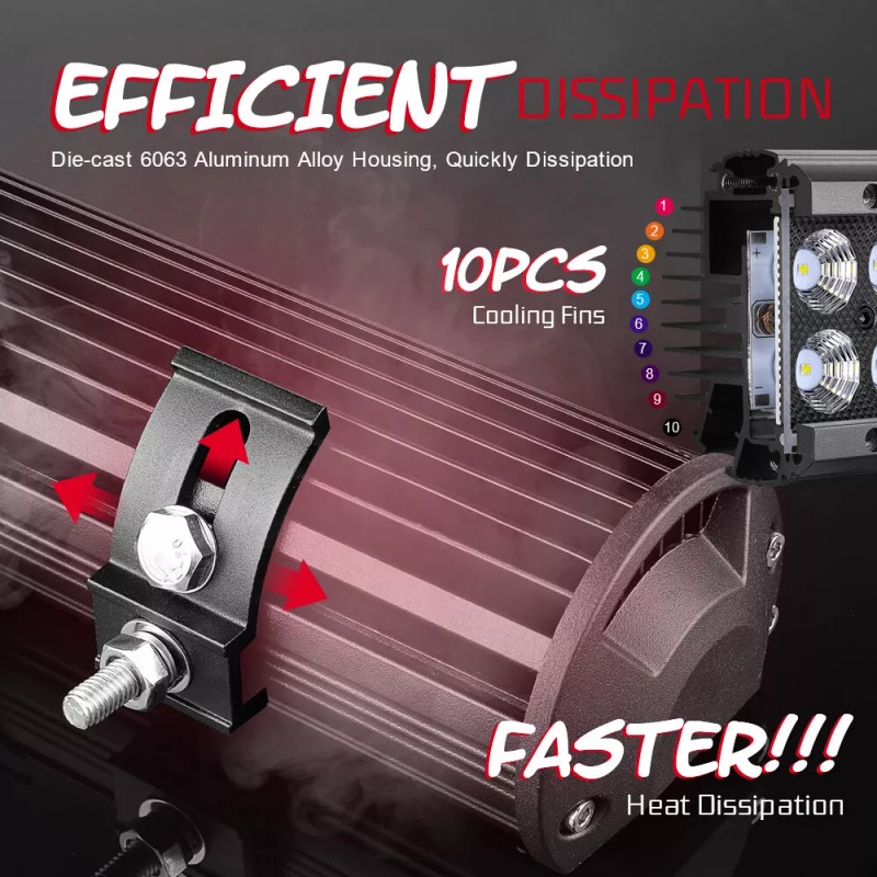 One of the key features of this LED light bar is its heat dissipation design. Oversize heat sink fins and quick cooling aluminum alloy heat sinks work together to effectively dissipate heat, preventing overheating and ensuring maximum performance. High-quality heat conduction silicone gel is also used to further extend the lifespan of the light bar, which can last for over 30,000 hours with proper care and maintenance.