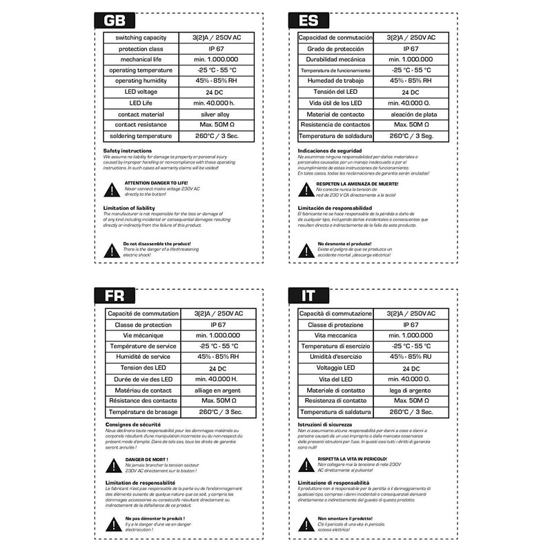 - Waterproof & dustproof (IP67 protection standard) LED switch with energy-saving lighting. Choice of colours: white, blue, red, green, yellow.