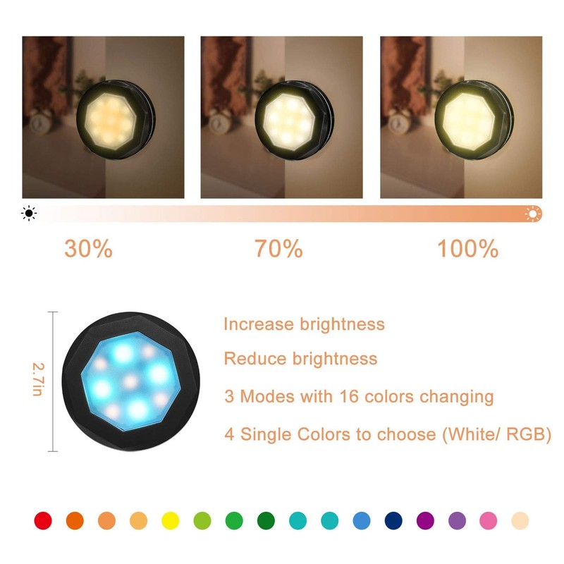 - đĄă10 Levels of Brightness and Time FunctionăLong touch the led puck lights to increase/decrease 10 level(10%-100%)brightness.Choosing 3 brightness modes(30%, 70%, 100%)by pressing the remote. You can set a timer(1/2H, 1H, 3H) with the remote control, in case of forgetting turn off the lights. To save battery power, the lamp will turn off automatically in 4H without any operation. Suitable as night lights in children's bedroom.