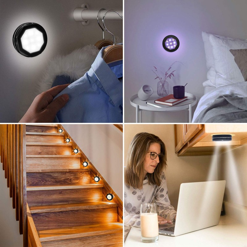 - đĄăUpgrated under cabinet lightăEach measures approx 2.7''*2.7''*0.9''. New high-grade octagonal design, matte anti-glare lamp shell, high-quality ABS material, rejecting cheap plastic feeling.not only be used as the colorful atmosphere lights and wall decoration lights, but also be used as cabinet lights, closet lights, corridor lights, cupboard lights, wine cabinet, showcase lights, bedroom night light or any under lighting to light up every dark corner in your house.
