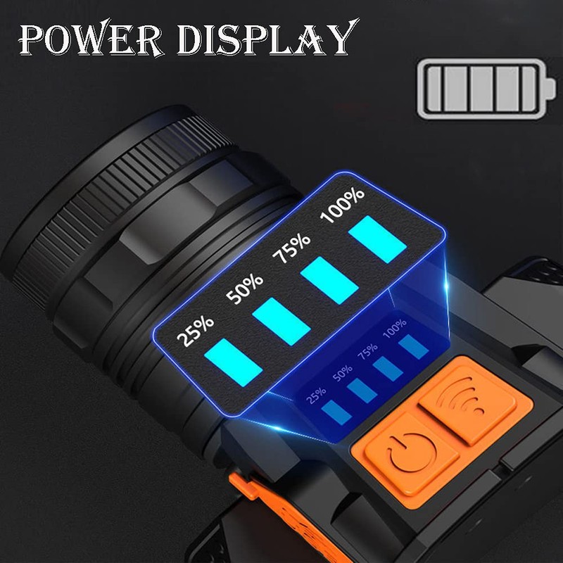 - ➤ Rechargeable Head Lamp with Output Function & Power Display - When you are in urgent need of electricity outside, led Headlamps can be a power bank provide output power to your external devices, it is not only a head lamp but also a power bank. The headlight is designed with 4led power indicator (100% - 75% - 50% - 25% power).