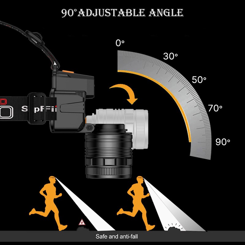 - ➤ 90º Adjustable Head lamp & Zoomable Head Light - Led Headlamp help you to see anything clear inahead by pivoting the head down 90º to avoid the pavement cracks,obstacles; You can zoom in/out to change the focus from broad illumination to a narrow long range beam, more perfect with your work.