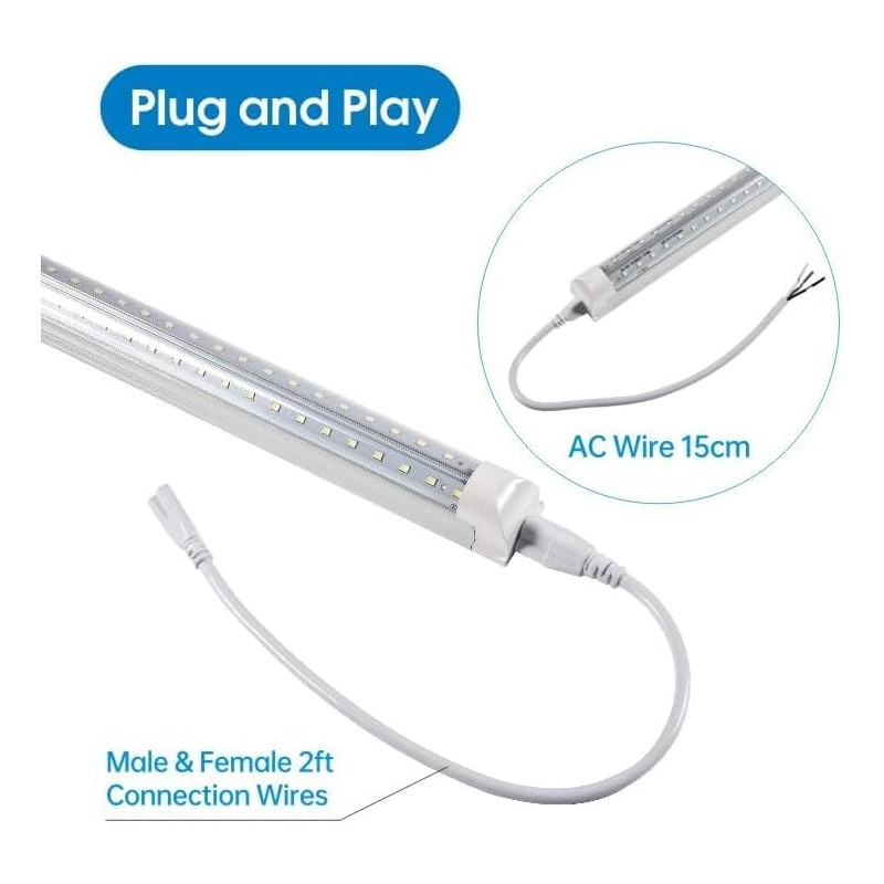LED Shop Light, 90W 11700LM 6500K, 8FT 270° Angel 2 Row LEDs V Shaped Integrated Fixture, T8 Tube Light, Cool White, Clear Cover, Higher Brightness, LED Shop Lights for Garage Warehouse Workshop 10 Pack, that provides optimal lighting for daily activities in garages, workshops, basements, warehouses, offices, and more. Scientific Design, The 2 Row LEDs V-shaped LED shop light offers a wide 270-degree beam angle and dual-row LED chips that deliver brighter and more efficient lighting, even in the darkest corners of your space. Linkable & Plug and Play, The V-shaped LED Shop light allows you to connect the lights using the included connector cords or connect them directly to a power source using the power cords. No complex wiring or installation required! Easy Installation, The pack of 10 fixtures comes with all the necessary installation tools, including clips and screws, to make it easy to install these shop lights in any flat place quickly and easily. Installation Accessories Included, Included in this pack are 10 T8 LED Light Fixtures, 5 Power Cords with ON/OFF Switch 5FT, 10 Hardwiring, 8 Connecting Cables 2FT, and an Accessories package containing clips and screws. Wide Application, These 8-foot LED Shop lights are ideal for a variety of indoor lighting needs, including garages, workshops, basements, warehouses, workbenches, homes, barns, offices, attics, storage rooms, and exhibition areas. Upgrade your lighting with this pack of 10 LED Shop Lights!